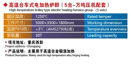 產品名稱:高溫臺車式電加熱爐群(5臺-萬噸壓機配套) 產品描述: